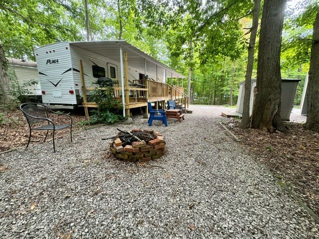 2012 Palomino Puma that sits tucked away in the C Section of the campgrounds. This turnkey unit features a newer deck and awning along with a king size bed. Included in the sale are shed, grill, patio table and chair set and EzGo gas golf cart.