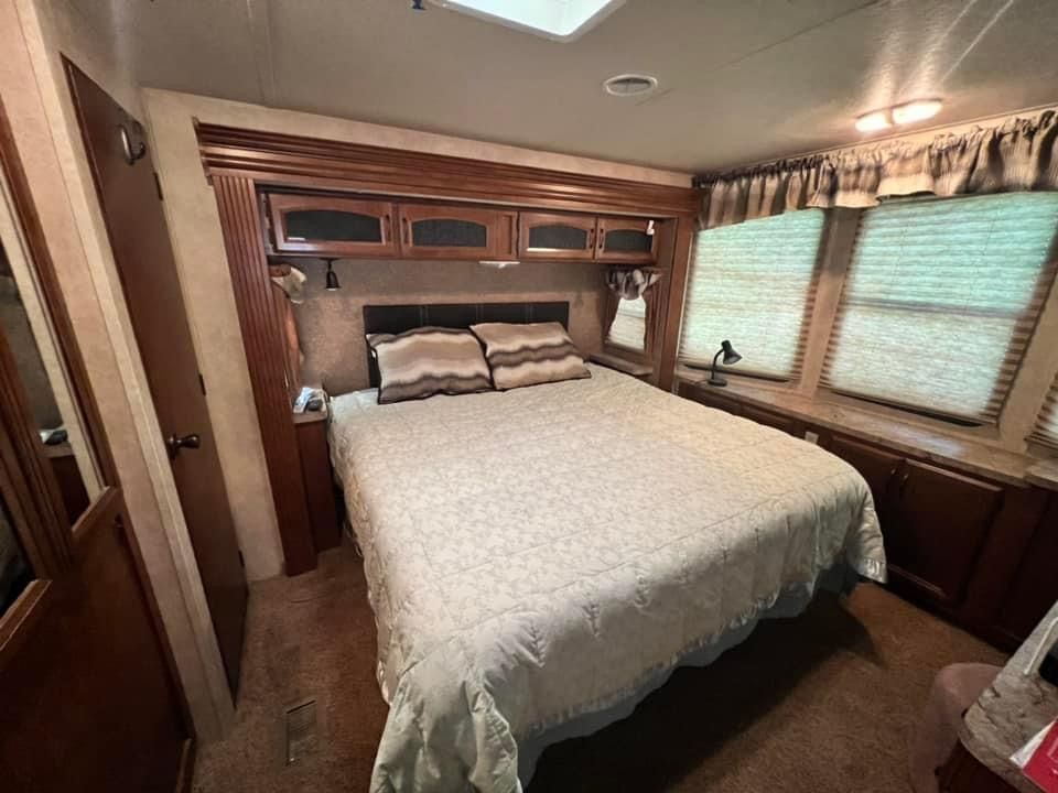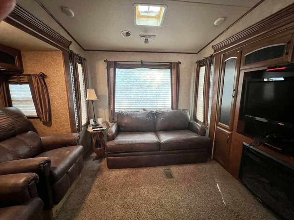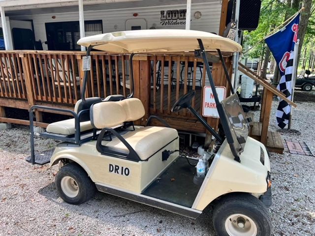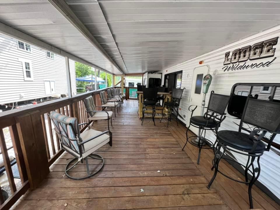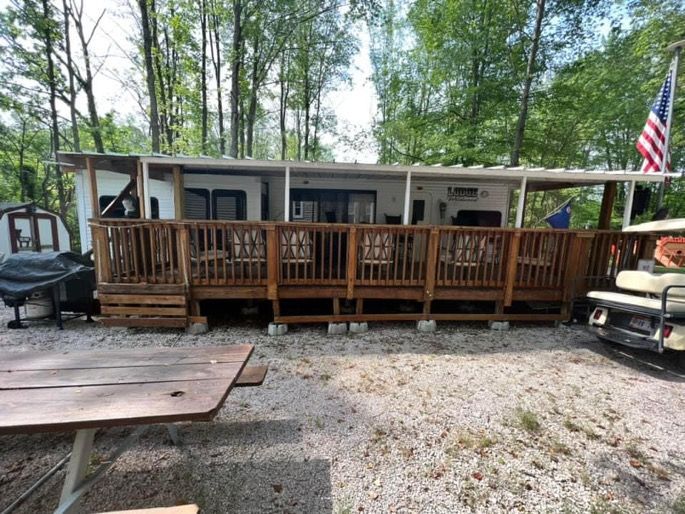2013 Forest River Wildwood Lodge model #393RLT. This well kept unit sits on a low maintenance lot in our Deer Run section of the park. It also features a large deck covered by a permanent aluminum awning, fire pit with 2 wood piles, and a 40gal blue tank. With the purchase of this you will also get a shed, electric club car with 2 year old batteries, patio furniture, TVs, and miscellaneous kitchen items.