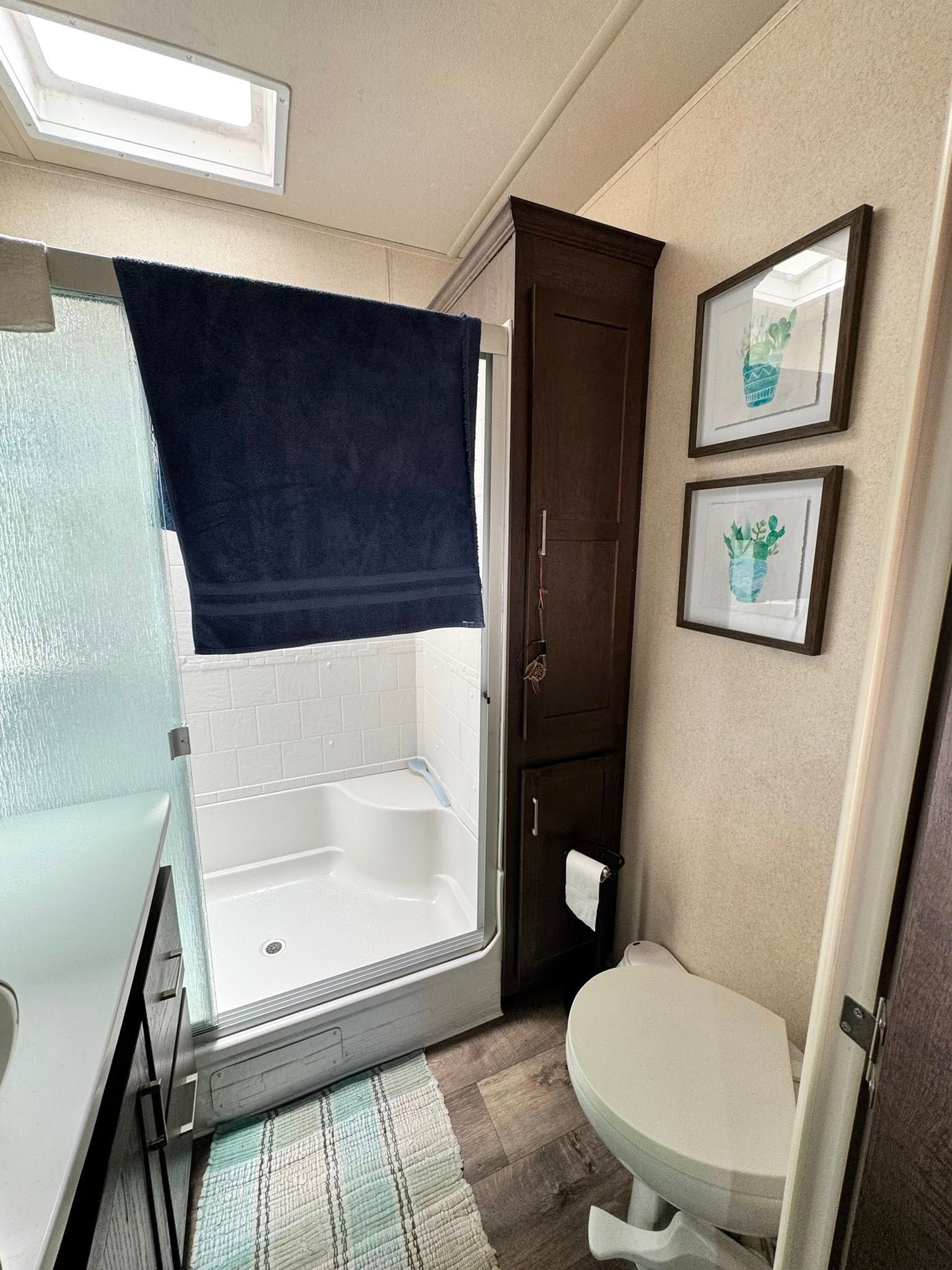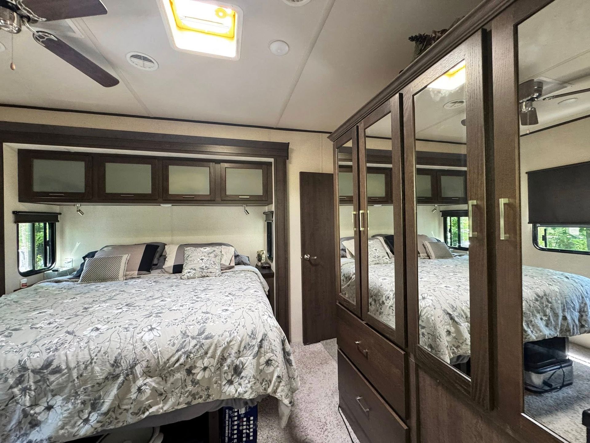 2018 Forest River Salem Villa model 394FKDS now for sale in the W section of the campgrounds. This well maintained move in ready unit comes with your choice of an electric or gas golf cart, shed, deck, aluminum awning, 2 full sized refrigerators, patio furniture, and other miscellaneous items. It also features a fireplace, high ceilings, and king size bed.