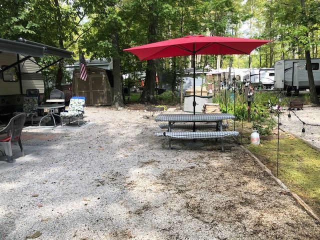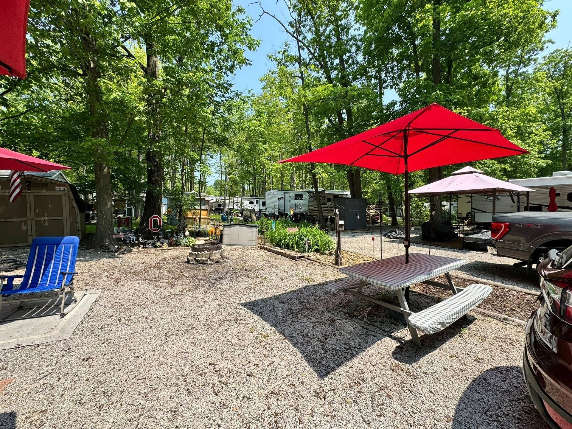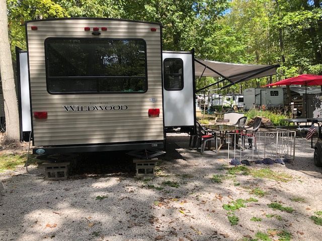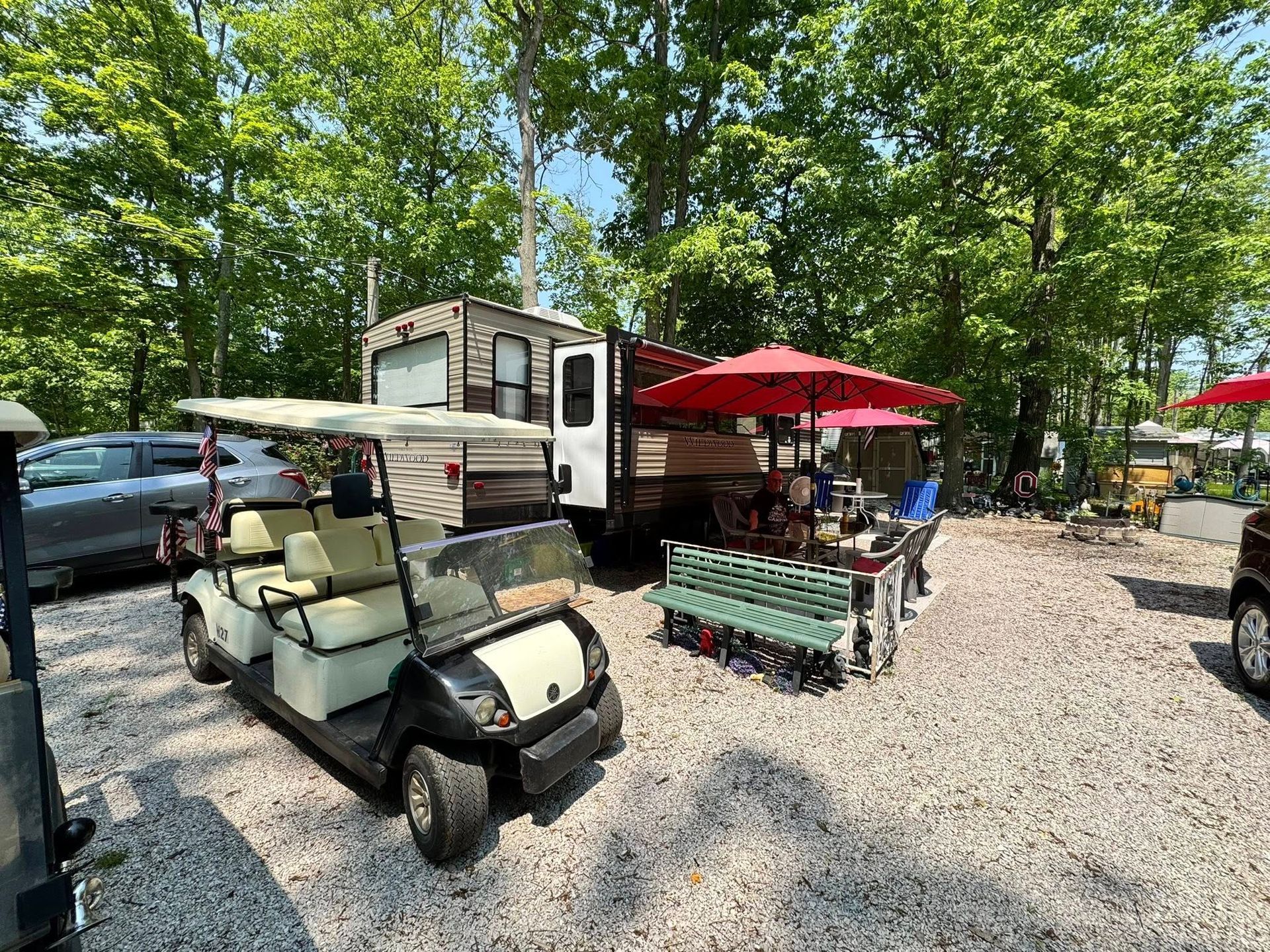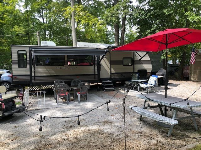 2019 Forest River Wildwood model 27RE now for sale in the W section of the campgrounds. This well kept unit sits on a low maintenance lot and features a panoramic view of the woods. Included in the sale is the electric golf cart, shed, and red umbrellas.