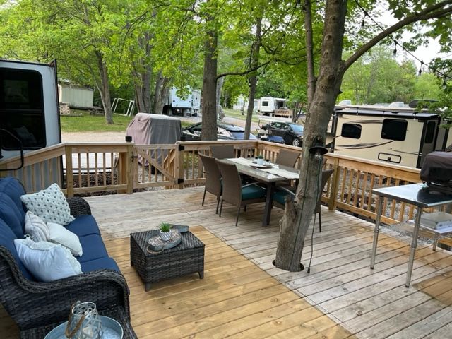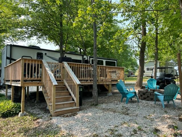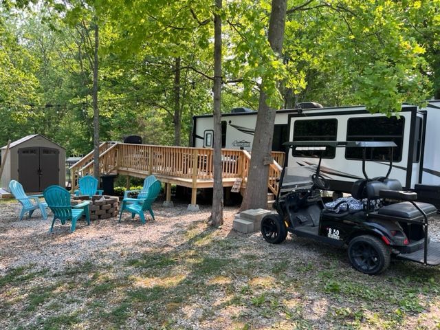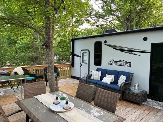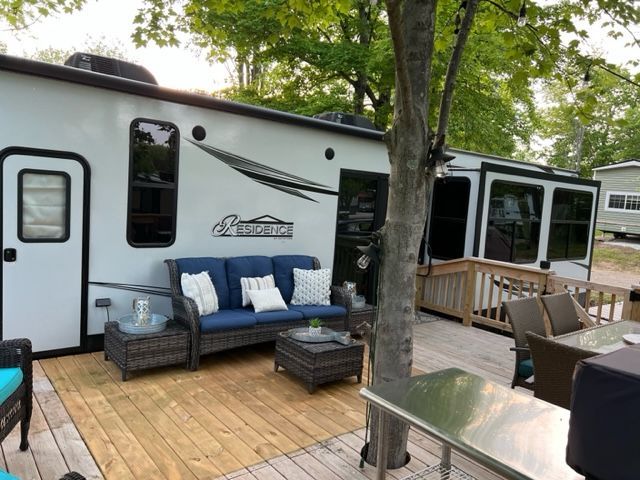 2021 Keystone Residence model #401MKTS for sale in our beautiful sunny B section of the park. This is a turn key unit that also includes a transferable warranty. With the purchase of this camper you will get a shed with new platform, new 16x20 deck, 2017 gas golf cart with trailer, patio furniture, lawnmower, and grill.