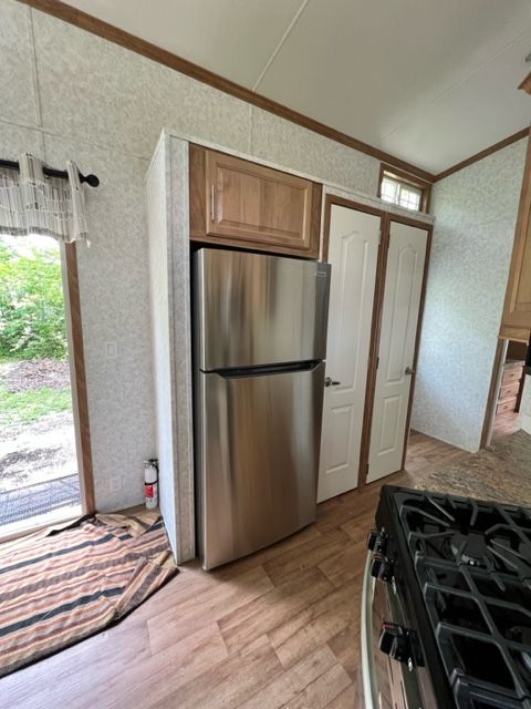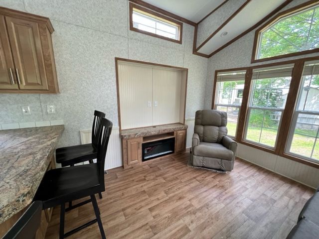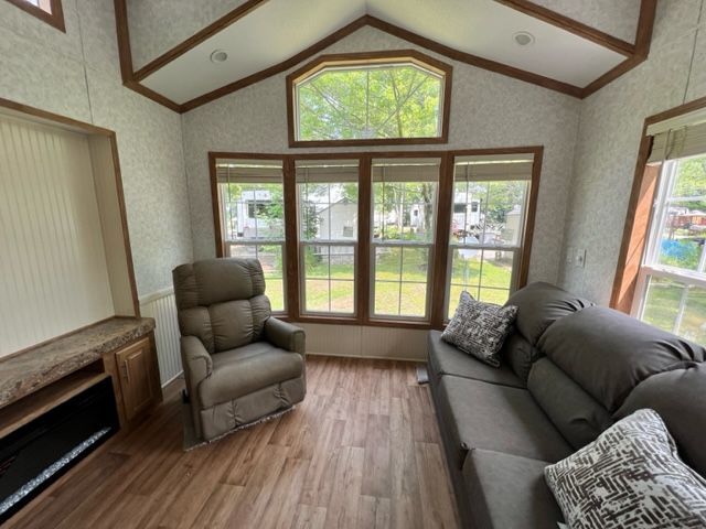 This unit features a Pebble colored interior, Butter Rum cabinets with brushed nickel handles, Aspin Plank flooring, box bay window with a fireplace, metal roof, and a lift up queen bed for extra storage.